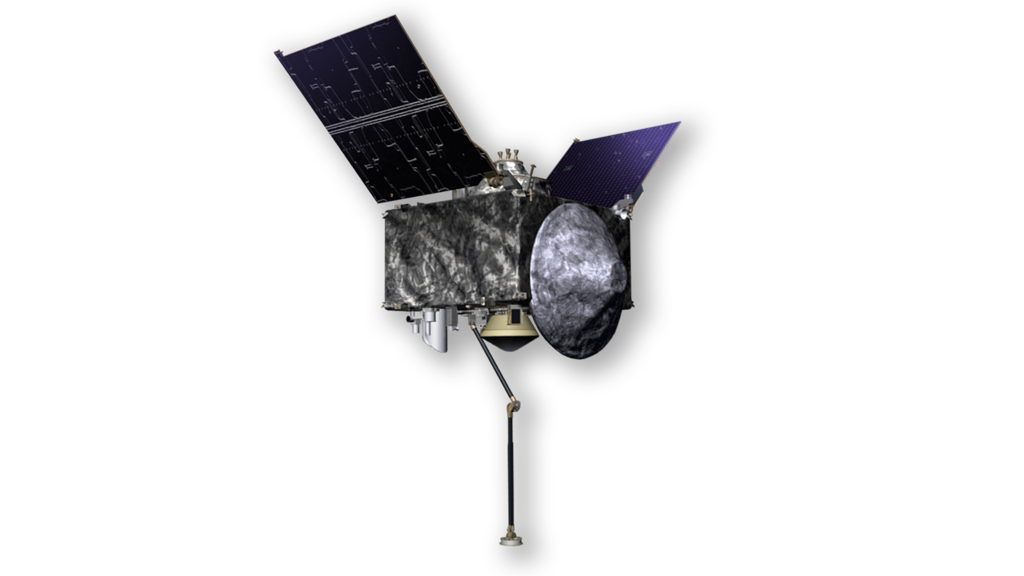 Illustrasjon av romsonden OSIRIS-REx idet den henter opp overflatemateriale fra asteroiden Bennu. Solcellepanelene er vippet opp i Y-posisjon for å redusere risikoen for at de dulter borti noen av de mange store steinene i området. Armen som henter inn prøvene har en lengde på 3,35 meter når den er strukket ut. (NASA/Goddard Space Flight Center/CI Lab)