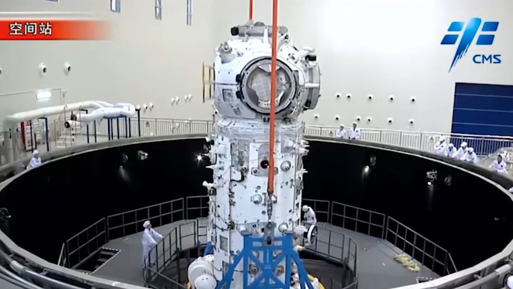 Tianhes likhet med kjernemodulen til den sovjetiske romstasjonen Mir er tydelig. Samme design er også benyttet på den russiske ISS-modulen Zvezda. Fire av Tianhe-modulens fem tilkoblingsluker befinner seg på den kuleformede seksjonen øverst. På samme del, pekende vekk fra kameraet, er det også en luke for romvandringer. Bare de to aksiale lukene er utstyrt for direkte tilkobling. Nye moduler vil derfor bli koblet til den fremre (øverste), aksiale luken, og deretter flyttet til en av de tre radiale lukene med en manipulatorarm. Også den teknikken ble benyttet på Mir. Folkene nede til høyre gir en indikasjon på størrelsen på modulen, som har en lengde på 16,6 m og største diameter på 4,2 m. Det interne arbeidsområdet er på 50 kubikkmeter, som vil øke til 110 når de to ekstra modulene er tilkoblet. (Foto: CMSA)