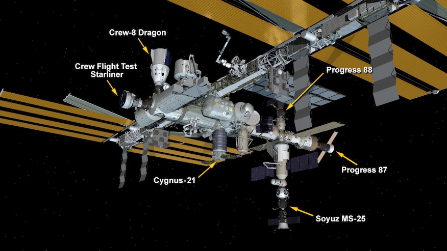 Etter at Suni og Butch ankom romstasjonen i begynnelsen av juni, har det vært ni personer om bord. På tittelbildet (figur) kan vi se de tre romskipene som benyttes av romfarerne (Crew Dragon, Sojuz og Starliner) samt tre forsyningsromskip.