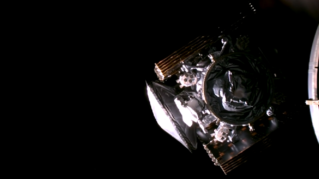 Tittelbildet: Europa Clipper rett etter frakoblingen fra andretrinnet på Falcon Heavy, litt over en time etter at oppskytingen startet. Bildet er tatt med et kamera på Falcon-trinnet. Alle solpaneler og intrumentbommer er foldet sammen.
