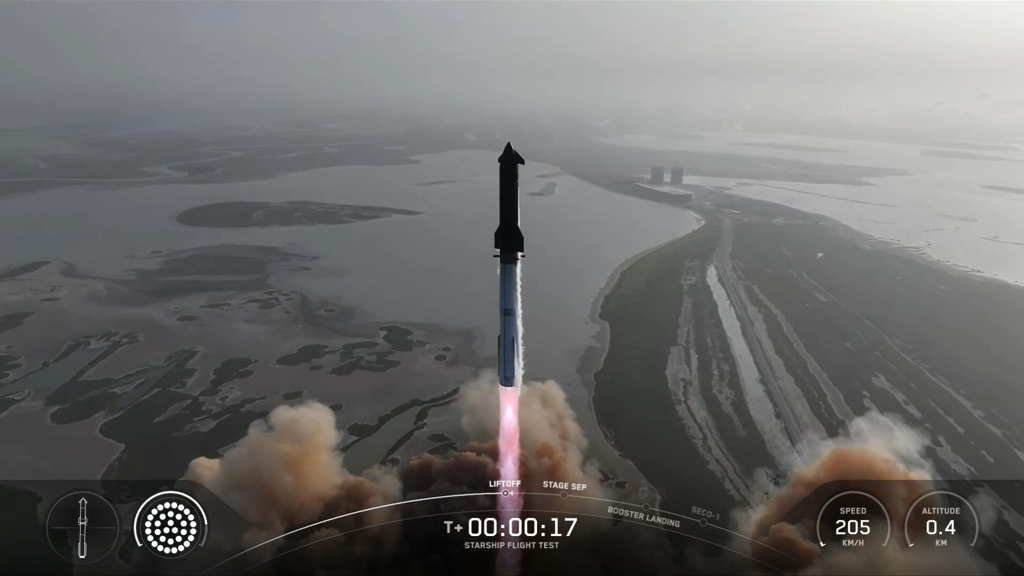 Tittelbildet: Starship tar av fra Starbase i Sør-Texas på den niende testferden, den 27. mai 2025.