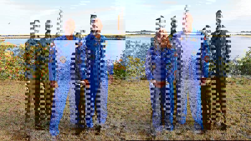 Astronautene og NASA-sjefen ved Kennedy Space Center etter at Artemis 2 var blitt rullet ut til oppskytingsplattformen.