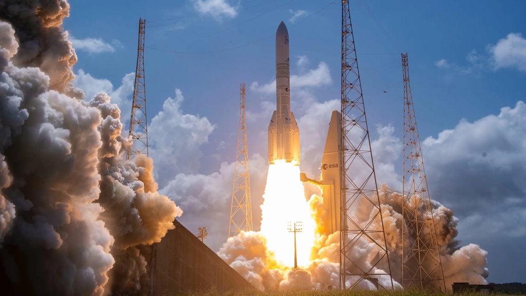 Over: Første oppskyting av en Ariane 6-rakett med fire faststoffmotorer, og den første med et langt nyttelastdeksel, som rommet 32 satellitter til Amazon Leo-konstellasjonen.
